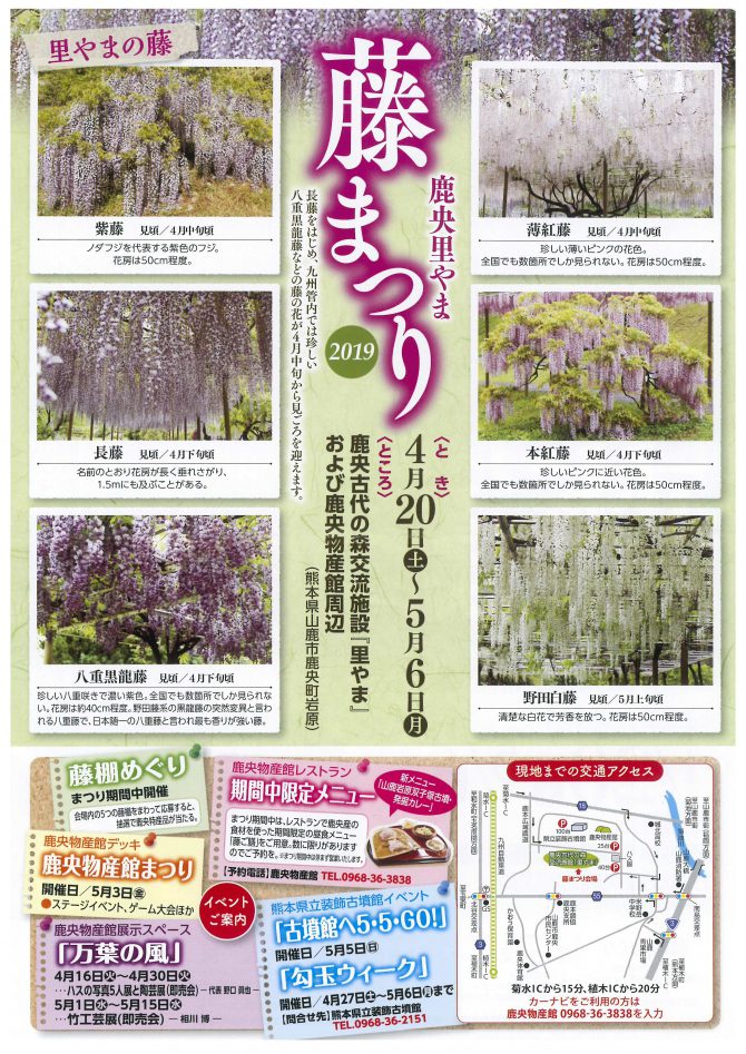 鹿央物産館周辺で、2019鹿央里やま「藤まつり」【4/20~5/6】が開催されます。 /