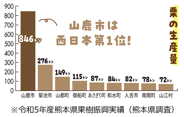 熊本県山鹿市は、栗の生産量では西日本一を誇り、毎年800トン程度が収穫されています。例年8月下旬から10月中旬ごろまで出荷は続きます。